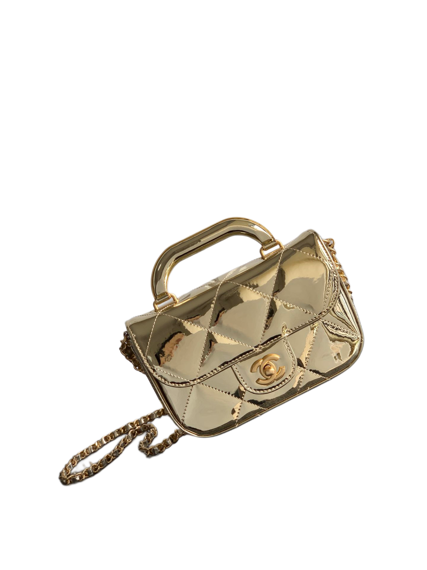 Kleine Clutch Mit Kette Kalbsleder Mit Spiegel-Effekt Goldfarbenes Metall Helles Gold